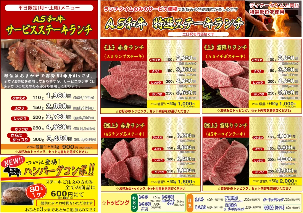 ランチメニューリニューアルしました!平日限定の「A5和牛サービスステーキランチ」にディナーと同じ部位を特選部位を選択できる「A5和牛特選ステーキランチ」ステーキご注文の方に待望の「特製ハンバーグコンボ」も登場しました! 創業から変わらぬ手作りの味「和牛10 […]